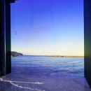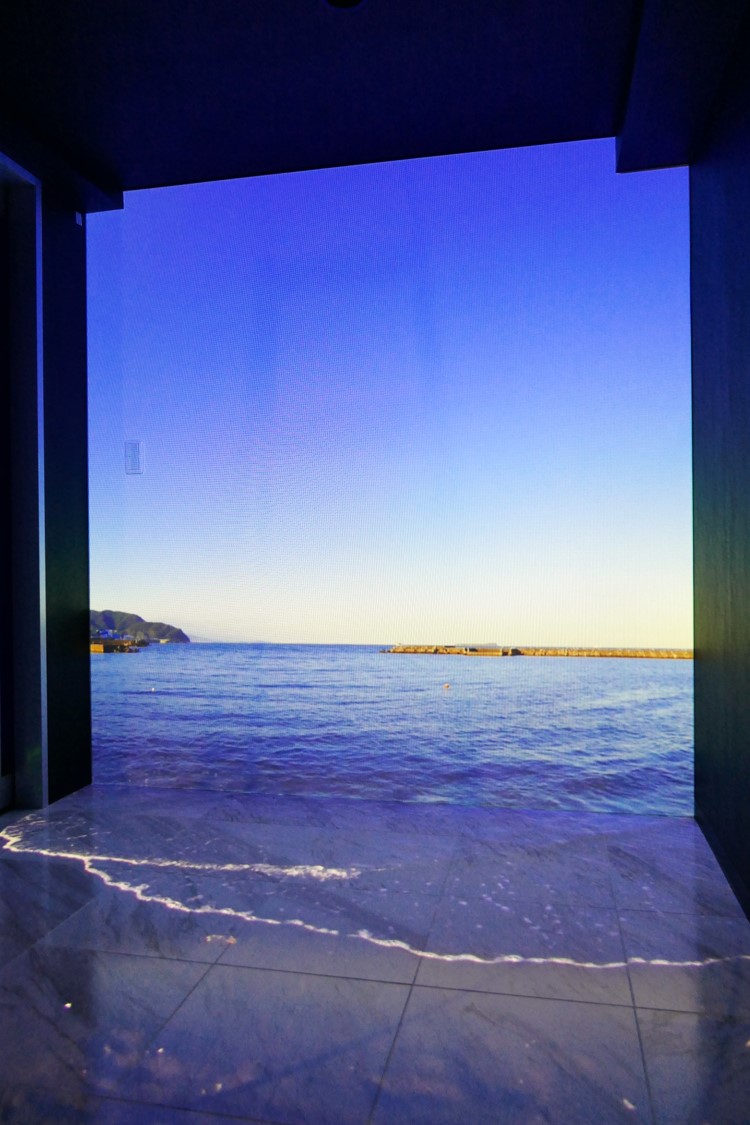 住宅の玄関入ってすぐ廊下突き当りに波の映像をマッピング。