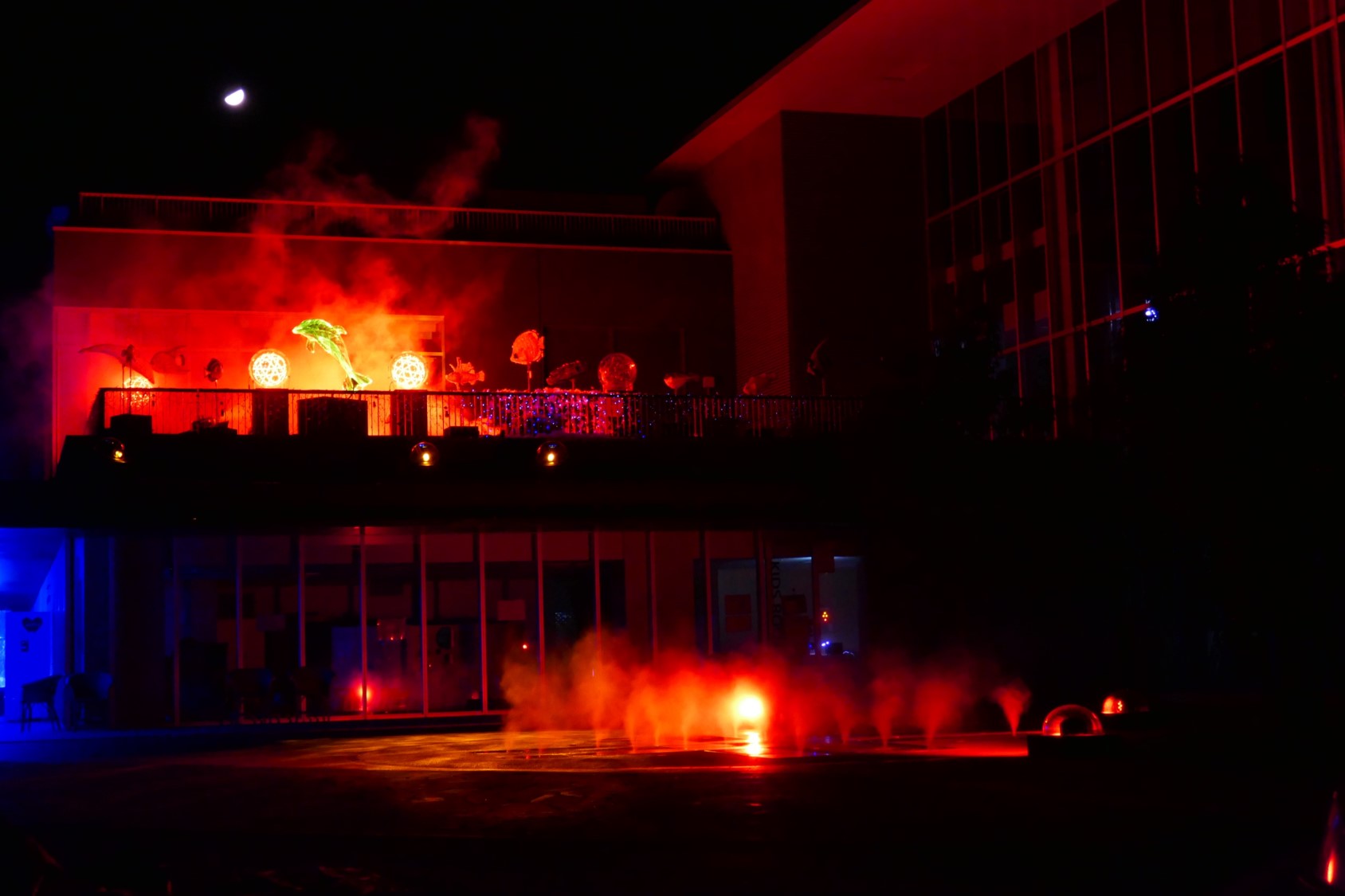 長崎県の大村競艇場でのイルミネーションの演出・施工を行いました。 大型のモチーフやムービングライト、ウォーターライト、スモーク、バブル、霧噴水などの演出装置を多く取り入れ、 ただ光っているだけではない見応えのあるショーを演出しました。
