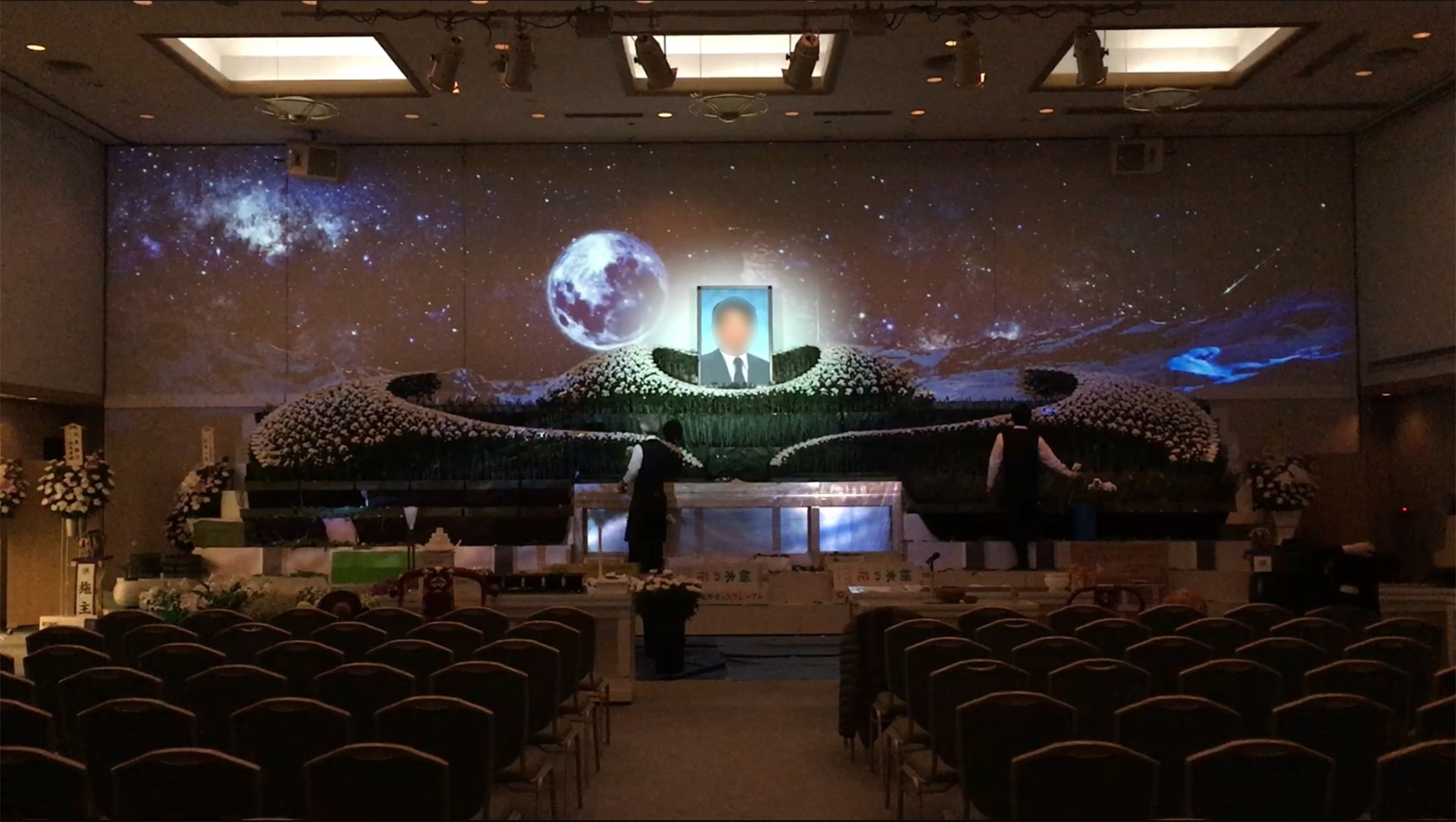 葬祭場の500名収容可能な大型会場をプロジェクションマッピングしました。